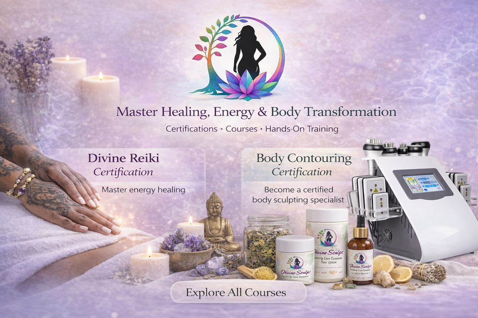 Certifications and hands-on training in healing, body contouring, and spiritual development.
